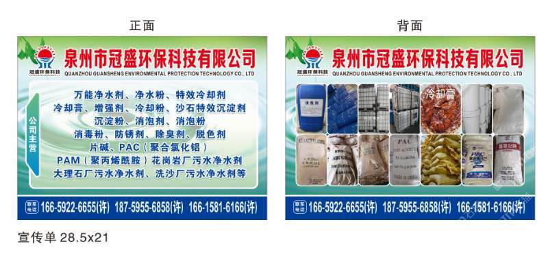 發(fā)布信息: 冠盛環(huán)??萍?6659226655 主營產(chǎn)品:凈水劑,冷卻劑,冷卻粉,大理石人造石專用凈水劑,沉淀粉,消泡劑,消毒凈水劑,防銹凈水劑,除銹劑,除臭劑,聚丙烯酰胺,聚合氯化鋁,鹵精,洗沙專用凈水劑,壓濾機(jī)專用凈水劑,陶瓷廠專用凈水劑(黃藥 白藥)等所有水處理環(huán)保材料……